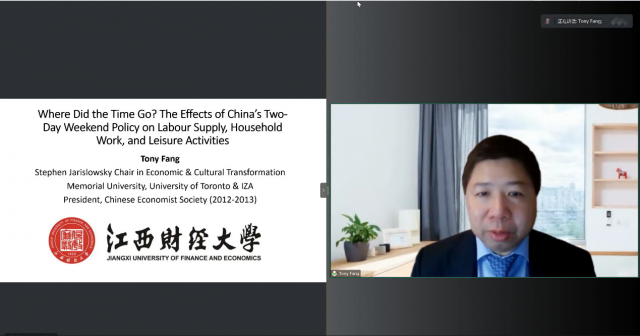 开展了纪念江西财经大学百年校庆2023年第一次学术活动,邀请到了纽芬兰纪念大学Stephen Jarislowsky讲席教授、加拿大多伦多大学兼职教授、方涛教授在线上进行讲学,本次讲座的主题是:中国双休制政策对劳动力供给、家务劳动和闲暇活动的影响,讲座由夏经霖老师主持,足彩分析
