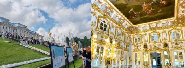 圣彼得得堡夏宫,俄罗斯帝国时代的一处重要皇家宫殿,建筑风格融合了巴洛克、古典主义和新古典主义等多种元素,展现出独特的艺术魅力。宫殿外观雄伟壮观,金色的雕塑和精致的浮雕在阳光下熠熠生辉,彰显着皇家的尊贵与奢华。夏宫内部装饰同样华丽精美,金碧辉煌的壁画、镶嵌的宝石、华丽的吊灯和精美的家具,都体现了俄罗斯宫廷文化的独特魅力。